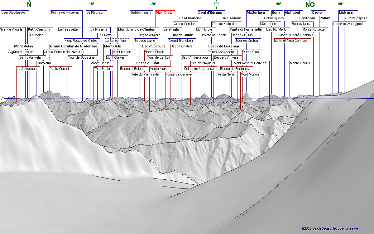 Breite: 45,58958° Länge: 7,27046° Höhe: 3483 + 10 m Blickfeld: 60° Zoom: 1X Vertikaler Blickwinkel: -2,5° Sichtweite: 300 km